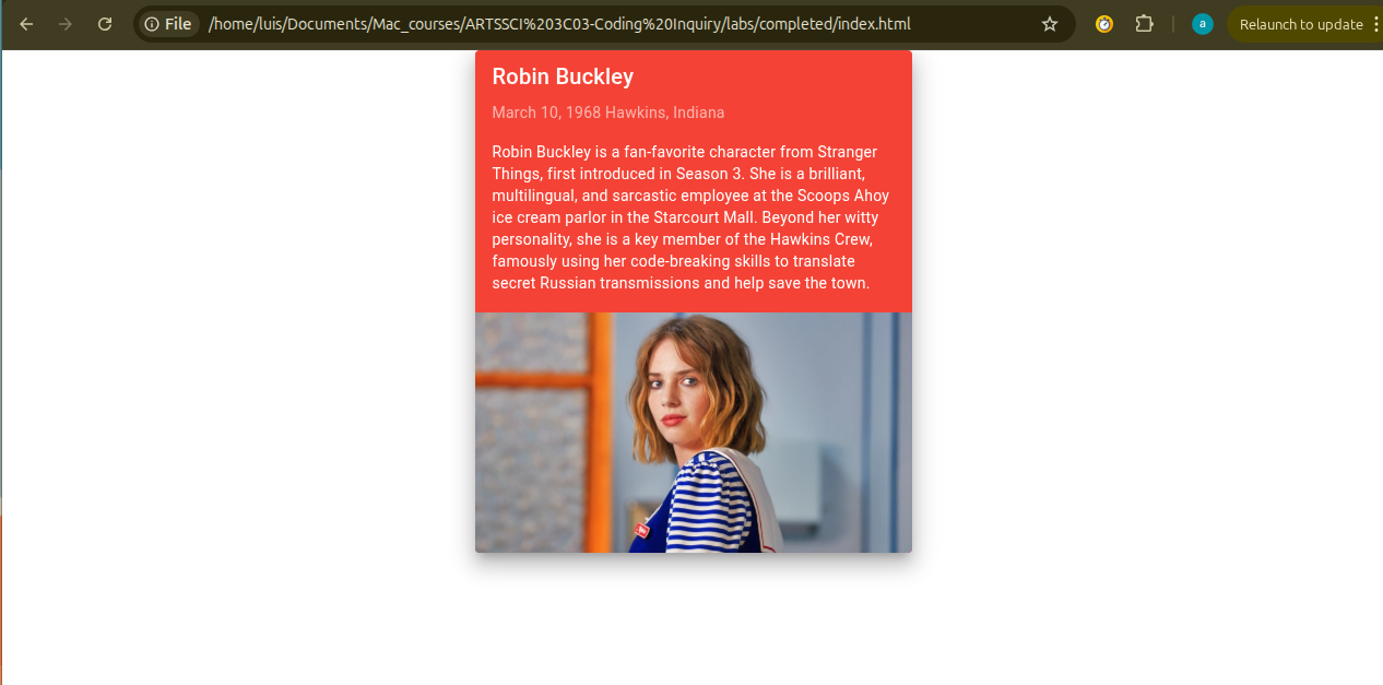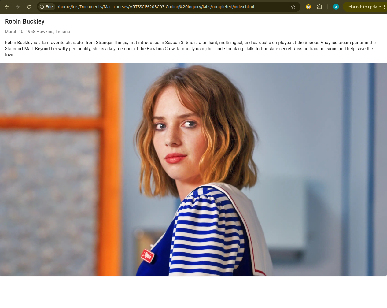 Now that you have one card working, try adding a second character or item to your collection! This will test your ability to link new data from JavaScript to your HTML.