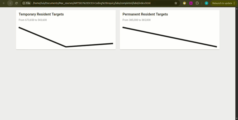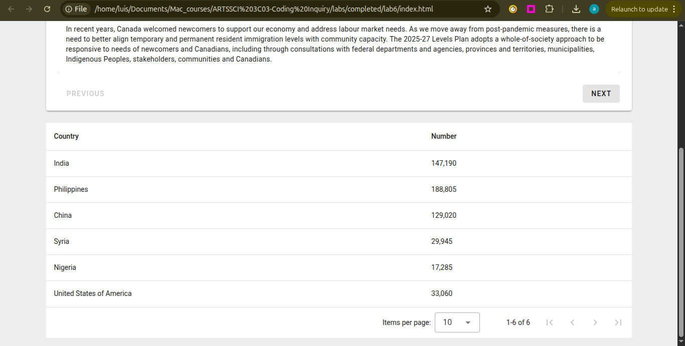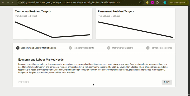 In this lab, you will build a dashboard that visualizes a specific topic using data-driven components. While this lab uses the 2025-2027 Canada Immigration Levels Plan as the primary example, you are encouraged to choose a different theme that interests you, as long as it follows the same data logic.
